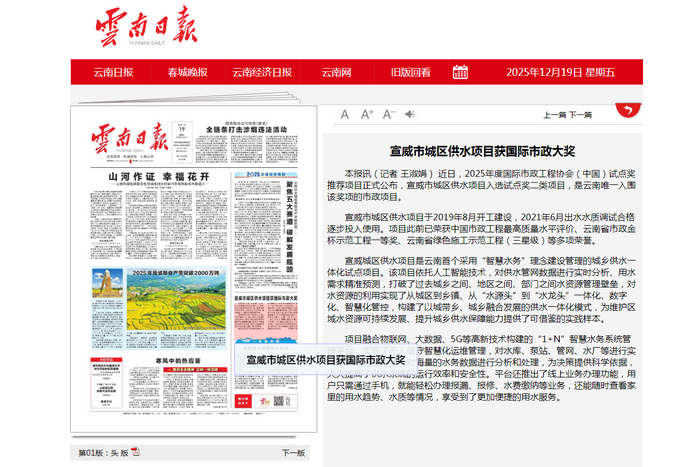 - 《云南日報(bào)》頭版:宣威市城區(qū)供水項(xiàng)目獲國際市政大獎